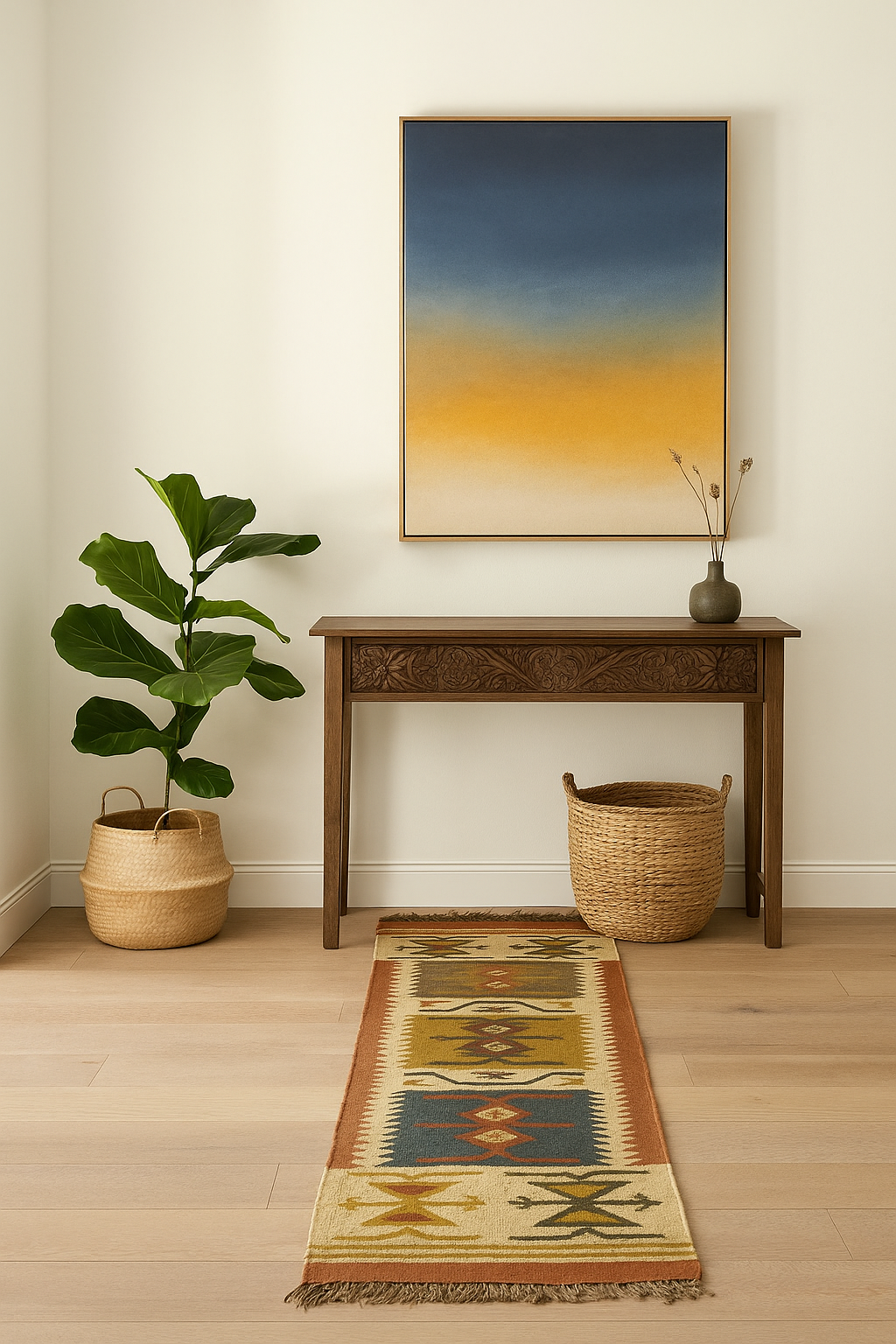 Crafted by hand from a durable jute and wool blend, this flatweave rug offers both resilience and texture underfoot. Its layered earthy hues and strong geometric patterns create a grounding yet dynamic aesthetic. Perfect for hallways, entryways, or as a statement layer at the foot of your bed.