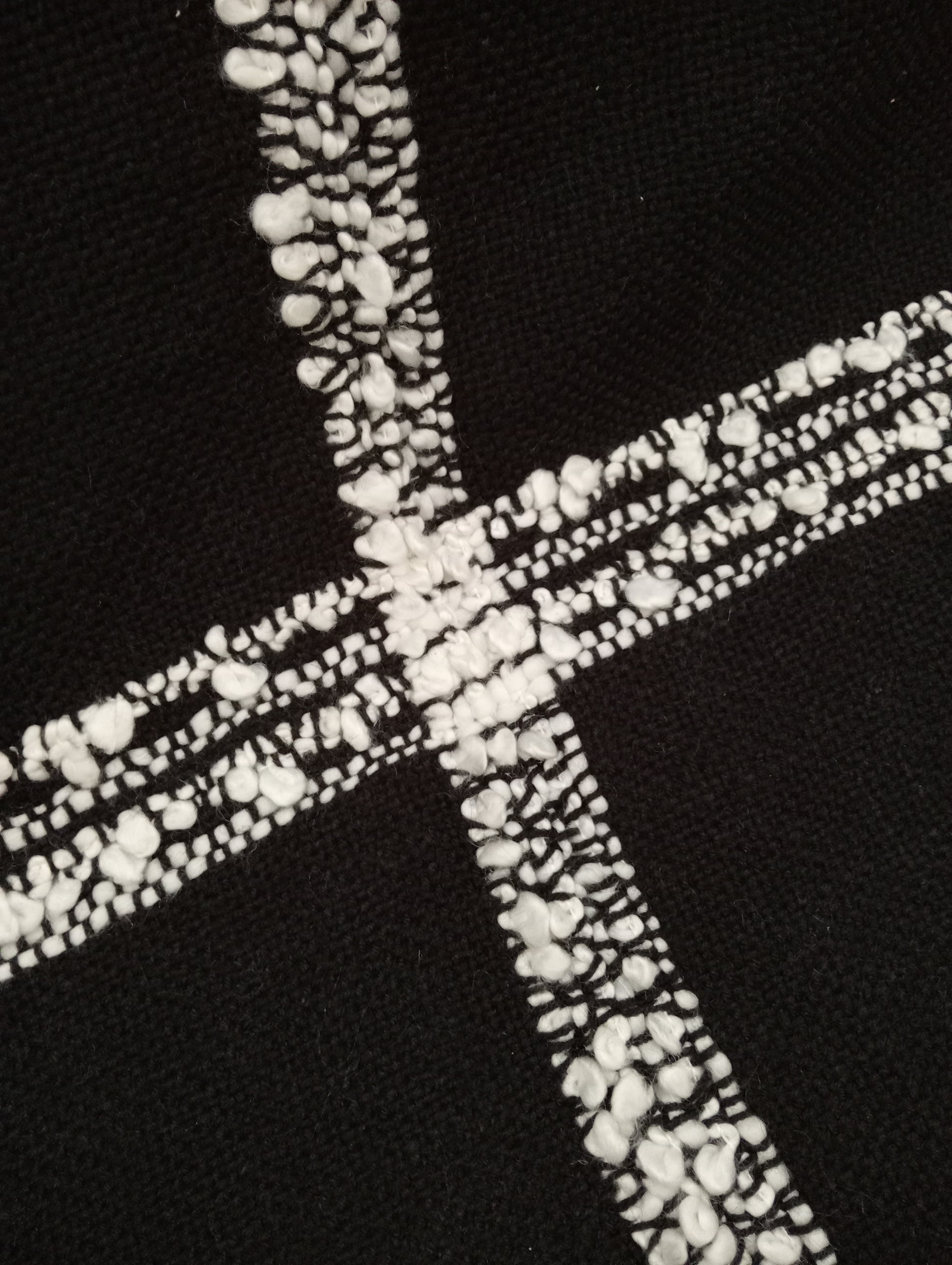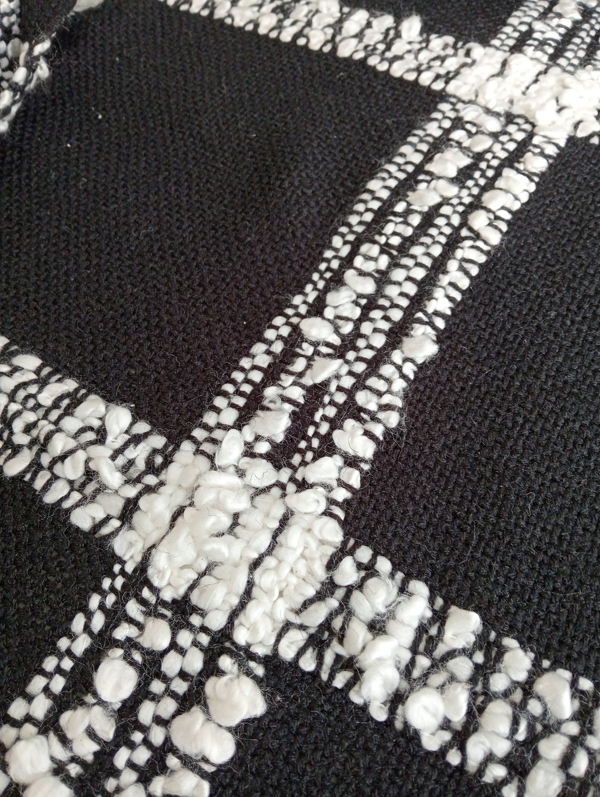 - Dimensional Detail: The white lines are three-dimensional and richly textured, showcasing varied threads and knots for a cozy, artisanal finish.