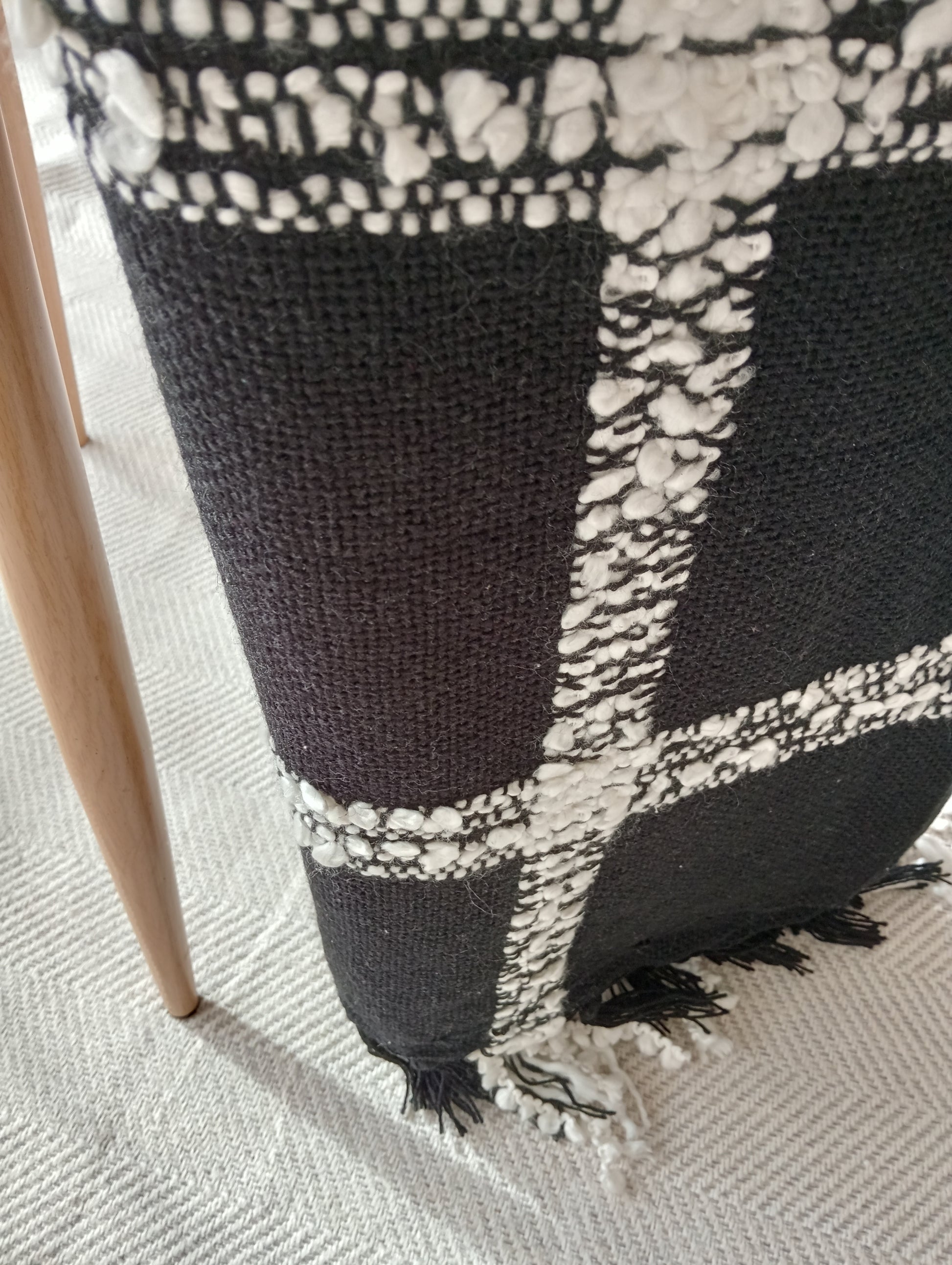 - Handwoven Check: Featuring a high-contrast black and white plaid (Mraba) pattern, the throw’s black base is intersected by thick, raised white yarns that form a beautifully tactile grid.